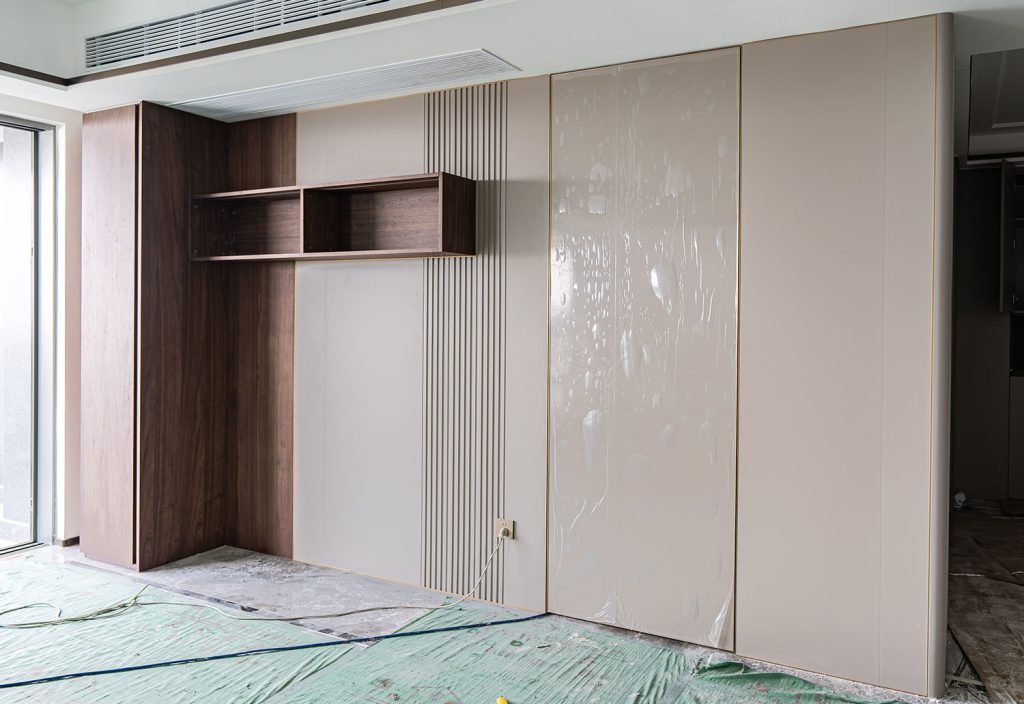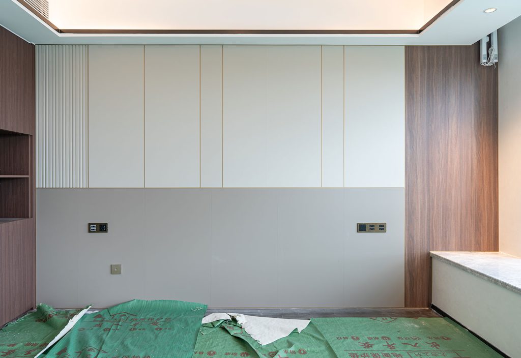 • Materials:Deep brown wood-grain panels, beige wood-grain panels, beige plain wall panels, and fluted wall panels.