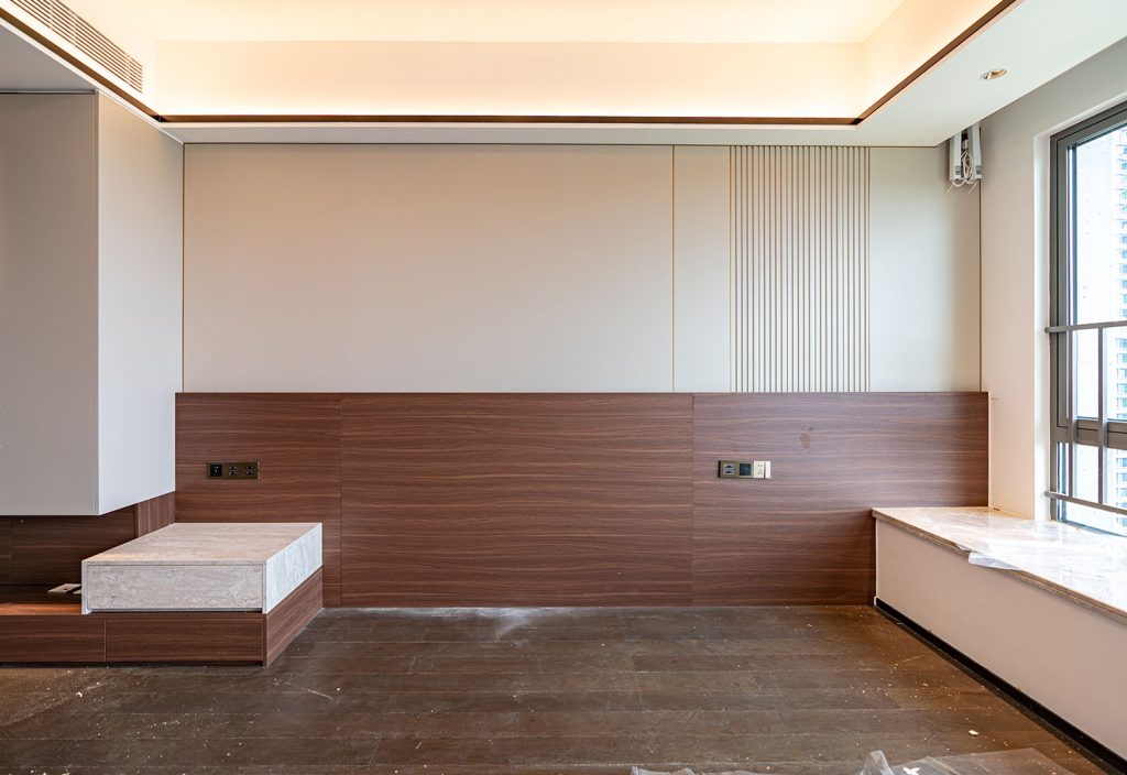 • Materials:Deep brown wood-grain panels, beige plain wall panels, and fluted wall panels.