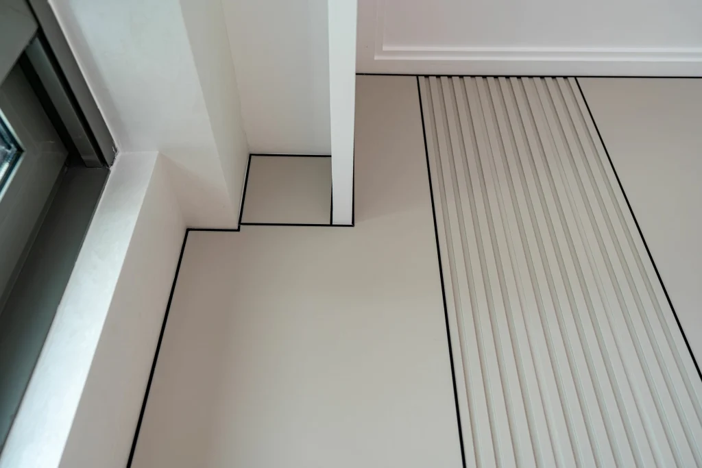 - Materials: Deep brown wood-grain panels, beige plain wall panels, and fluted wall panels.
