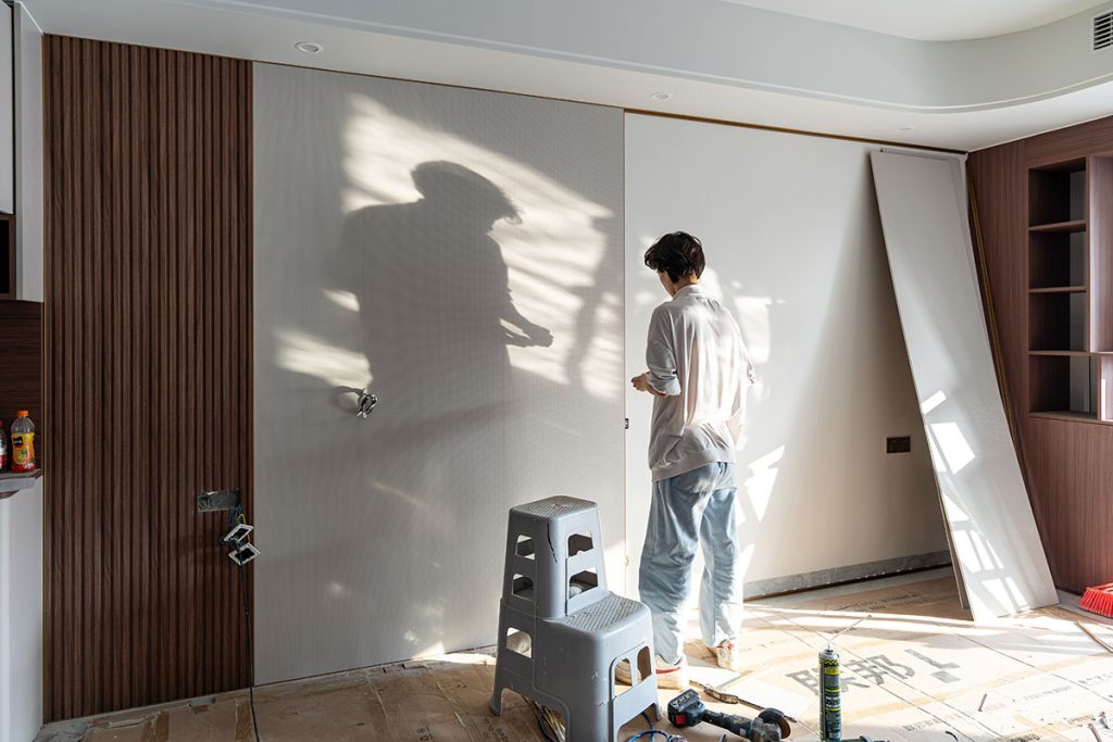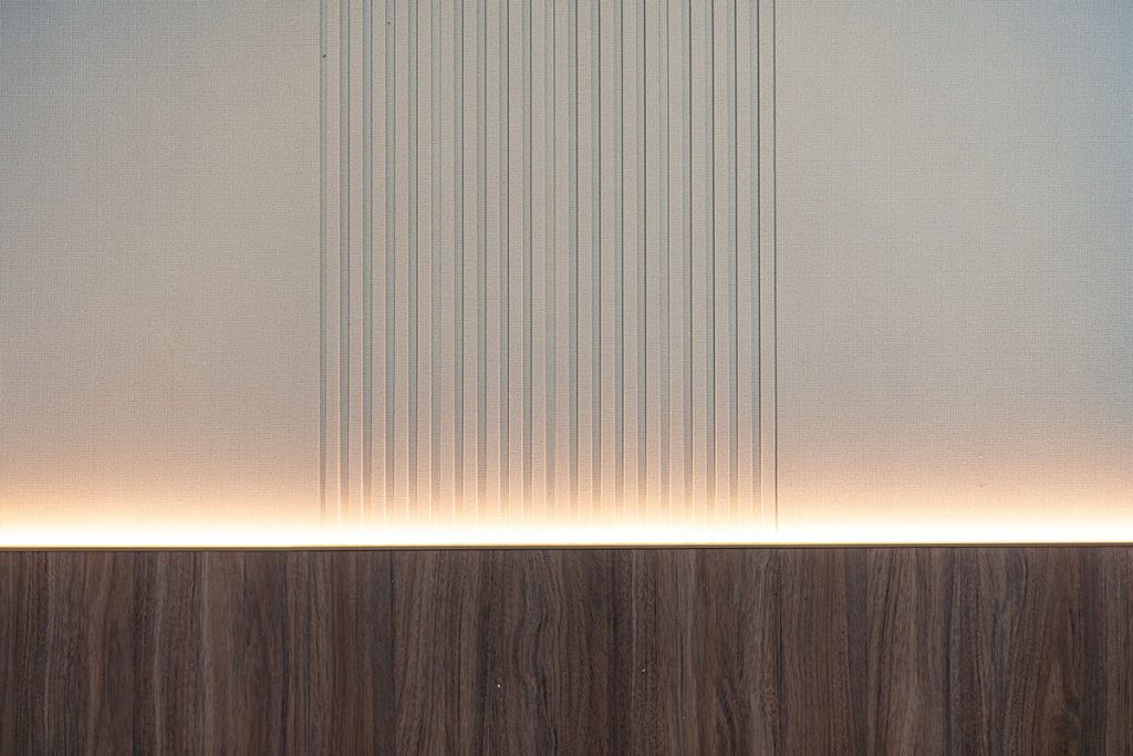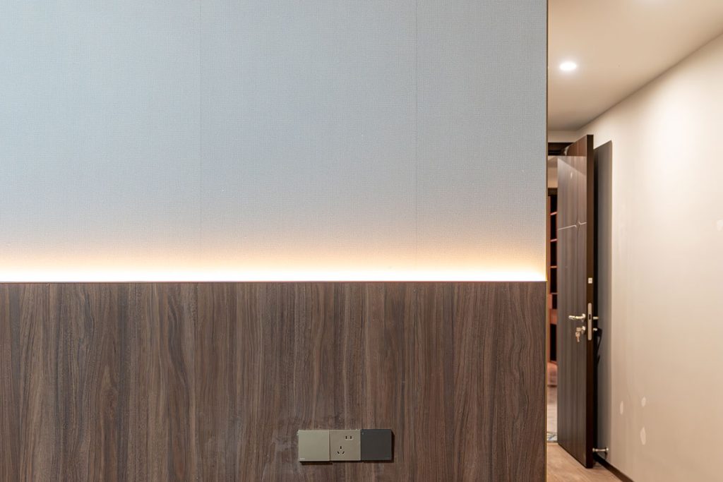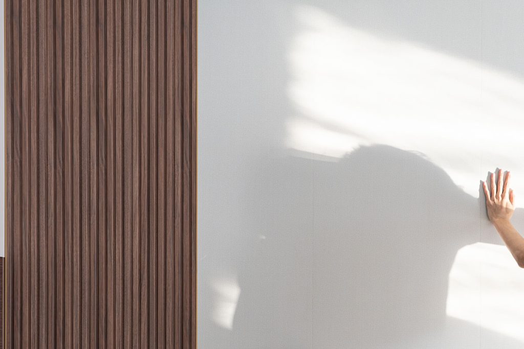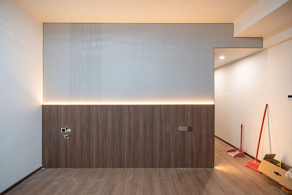 - Use of wood-grain, fabric-textured, and fluted wall panels for visual depth